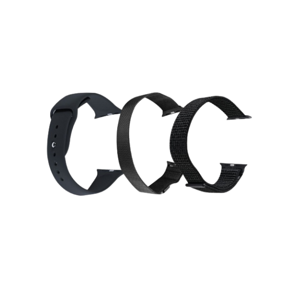 حزمة من 3 أشرطة لجهاز Apple Watch باللون الأسود بحجم 45/49 مم Pure Gear. الأشرطة مناسبة لساعات Apple Watch بمقاسات 45 مم و49 مم وتأتي بألوان الأسود والرمادي.