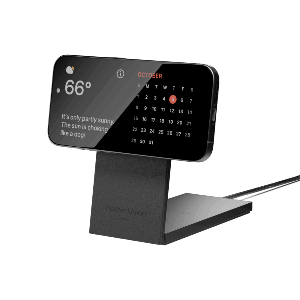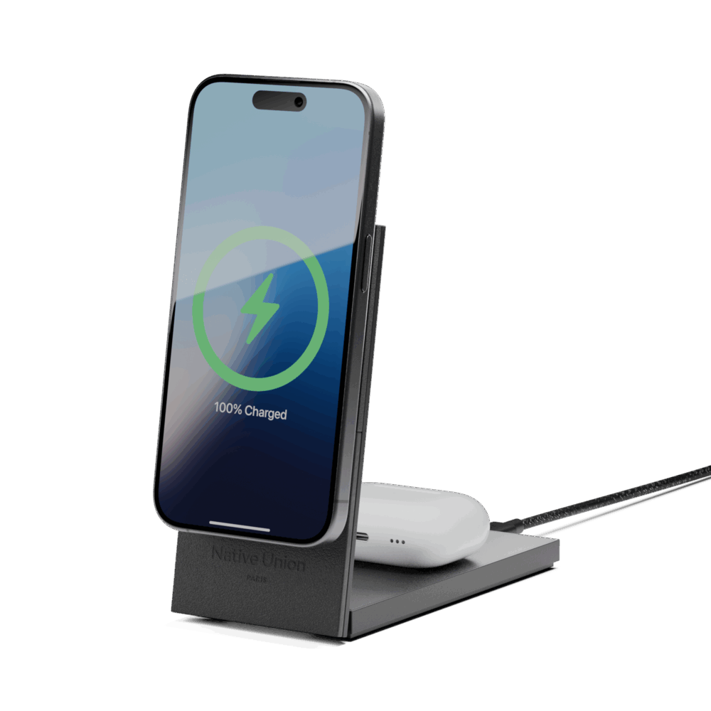 شاحن Rise 2-in-1 مغناطيسي ولاسلكي – يوفر شحنًا سريعًا لـ iPhone وAirPods بتصميم عصري ومدمج. يدعم تقنية Qi2، وزاوية قابلة للتعديل، وقاعدة معدنية مستقرة، وتشطيب بلمسة جلدية. يأتي مع كابل USB-C بطول 2