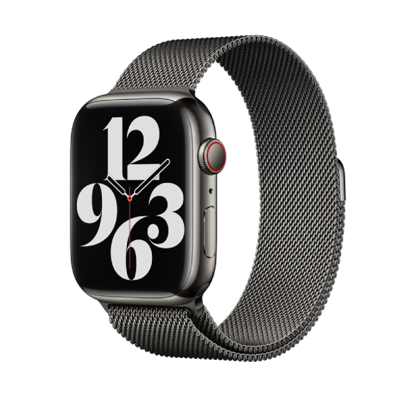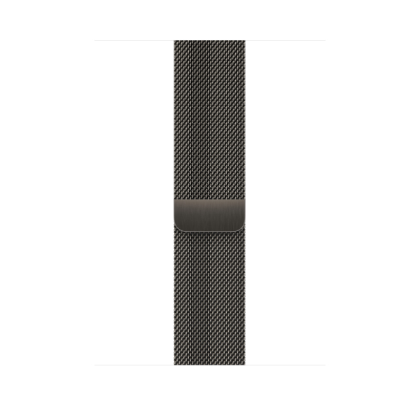 רצועת מילנזה למכשיר אפל ווטש בגרפיט, זמינה בגדלים שונים. הרצועה עשויה פלדת אל-חלד, תואמת לדגמי 42mm, 44mm ו-45mm.