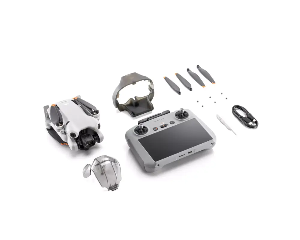 רחפן MINI 4 PRO, שלט DJI RC 2, סוללת טיסה, זוג פרופלורים להחלפה, 6 ברגים, מברג, כבל PC מסוג TYPE-C אל TYPE-C, מגן גימבל, מחזיק פרופלורים.